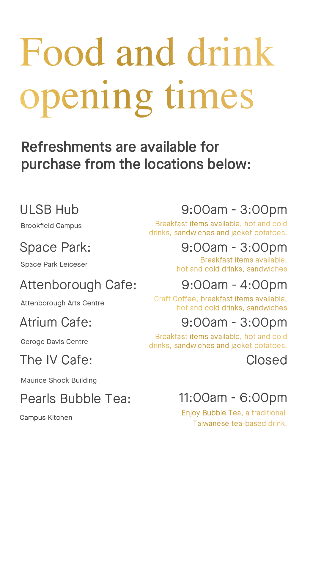 *PLEASE NOTE: Scroll down to see changes to opening times on Thursday only.